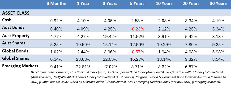 The following outlines the returns across the various asset classes to 30 September 2025.