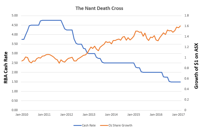 This is what we’ll call ‘The Nant Death Cross’. Three years of lacklustre market returns intersected with a falling cash rate. For the frustrated and uneducated investor, this was probably the point where alternate investments start to look good. The latest rally was likely another false dawn because the next crash was surely coming, while their cash was offering diminishing returns.