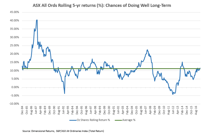The following chart of the rolling 5-year performance of the ASX All Ords Accumulation index gives a good indication of the historical performance of the ASX. Every chart point is the end of a 5 year period. In some ways, it’s a better historical indicator than an average return because we don’t all start investing at just one point in time. The chart below shows the average return across the timeframe was just over 11%, but there were 5 year periods where you could knock it out of the park or alternatively step in doggy do-do at the park.